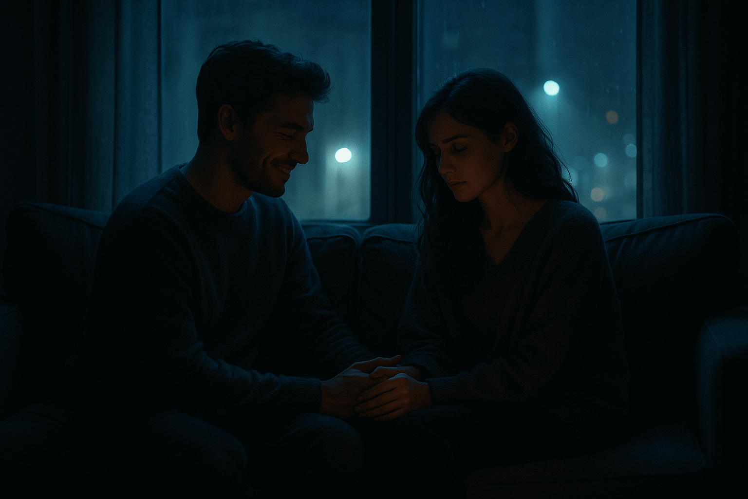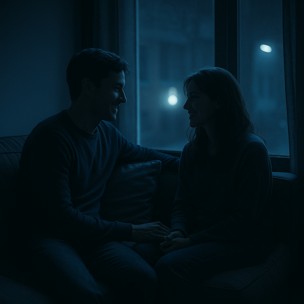 あのね、窓際のソファに座るカップル。暗闇に中で電気もつけず、ただお互いの気配を感じてるの。