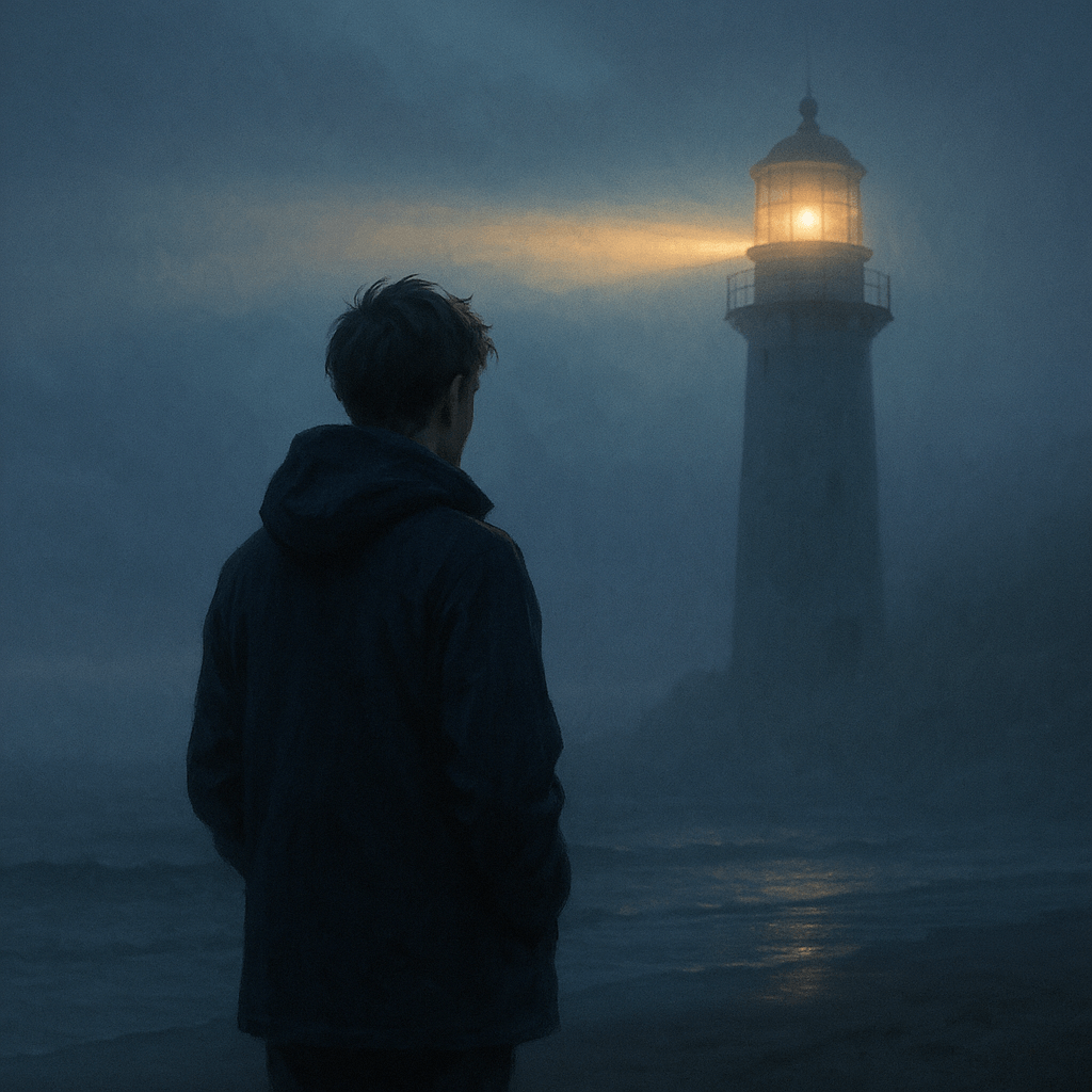 霧の中に浮かぶ灯台の光が、まるで「ここにいるよ」って優しく呼びかけてるみたい。