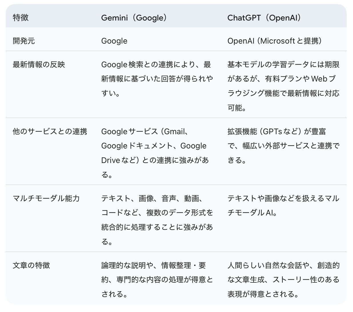 * 最新の情報収集や実務的なタスク(Googleサービスとの連携)を重視するなら、Geminiが強力です。