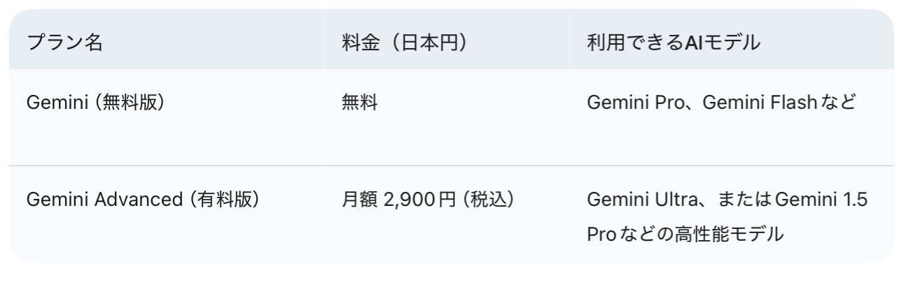 ご自身の利用目的(Googleの仕事ツールとの連携を重視するか、純粋なAI性能や創造性を重視するか)に応じて、どちらの有料プランを選ぶか検討すると良いでしょう。