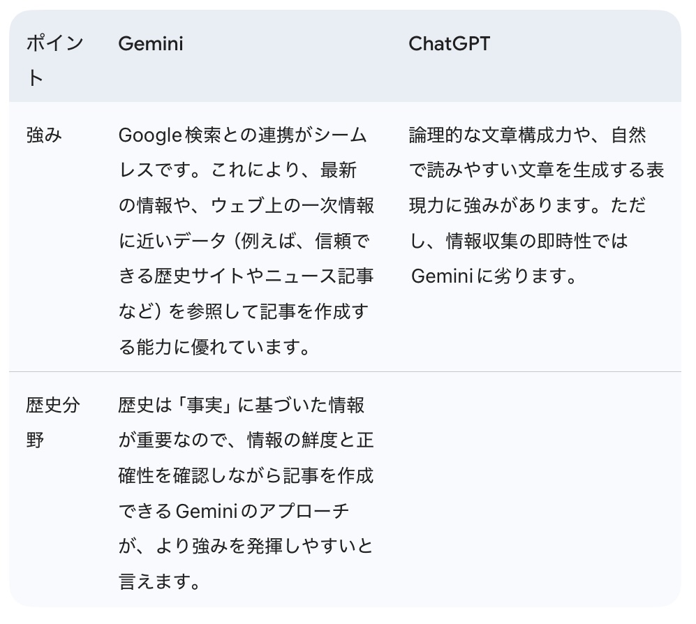 * Gemini:情報に基づいた記事、専門性の高いトピック、要点をまとめた記事の作成に強みがあります。Google検索の情報を活用できるため、最新のデータや事実を盛り込んだり、論文やリサーチ結果を基にした論理的で正確性の高い文章を作成するのに向いています。