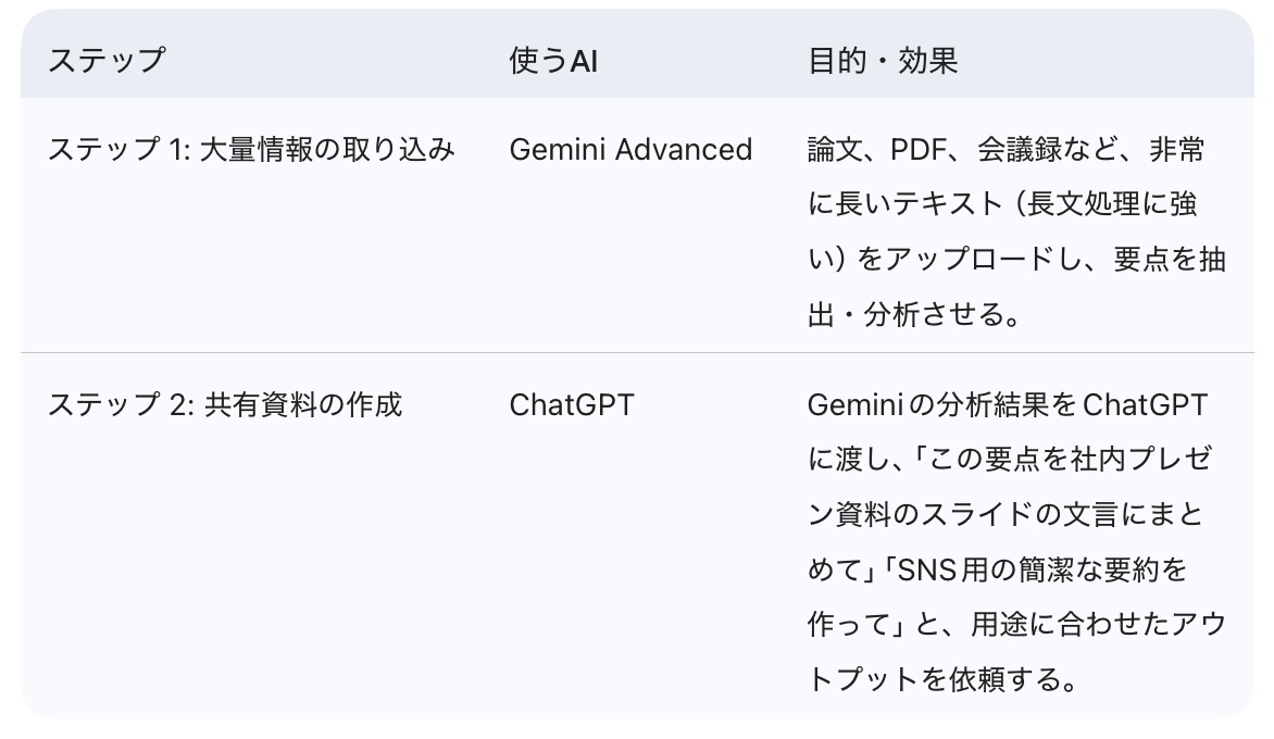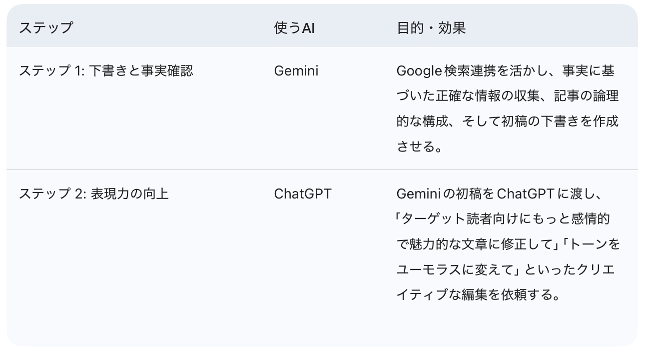 このとき、ChatGPTとGeminiの得意分野を活かしてリレーするのは、まさに理にかなっています。
