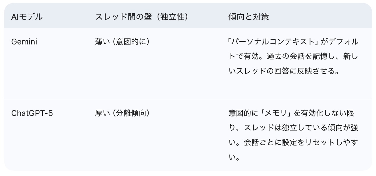 * 最新のモデルでは、**「メモリ」**機能がより明確に分離・管理されるようになり、意図的にメモリに登録しない限り、チャットスレッド間の独立性(壁)が強化された可能性があります。これは、AIの回答の安定性や予測可能性を高めるための設計変更と考えられます。