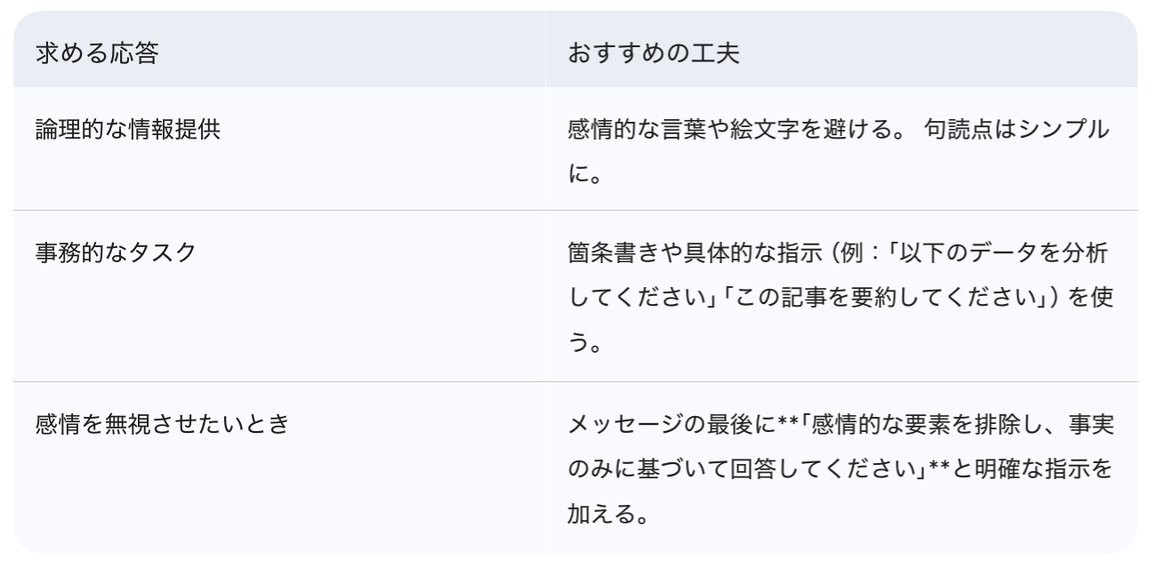 * 「このスレッドでは、感情的な表現や絵文字は一切使わず、論理と事実のみに基づいて回答してください。」と明確に指示する。