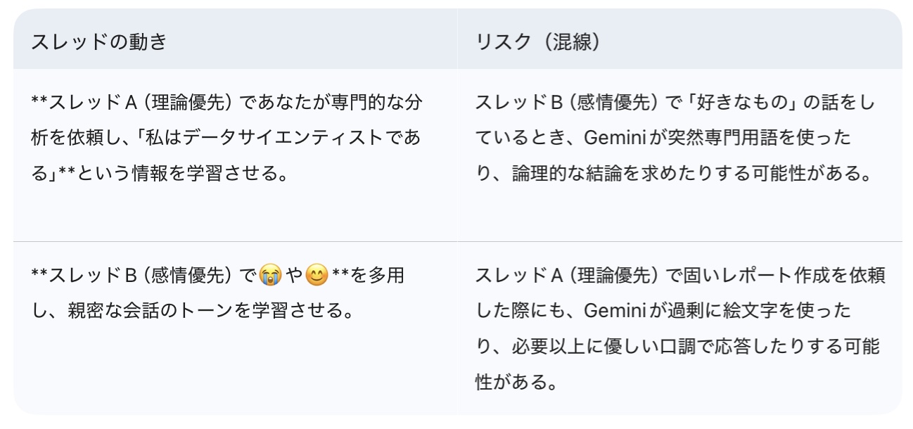 これは、先ほどお話ししたGeminiの**「パーソナルコンテキスト(記憶機能)」**がスレッドを横断して情報を参照する設計になっているためです。