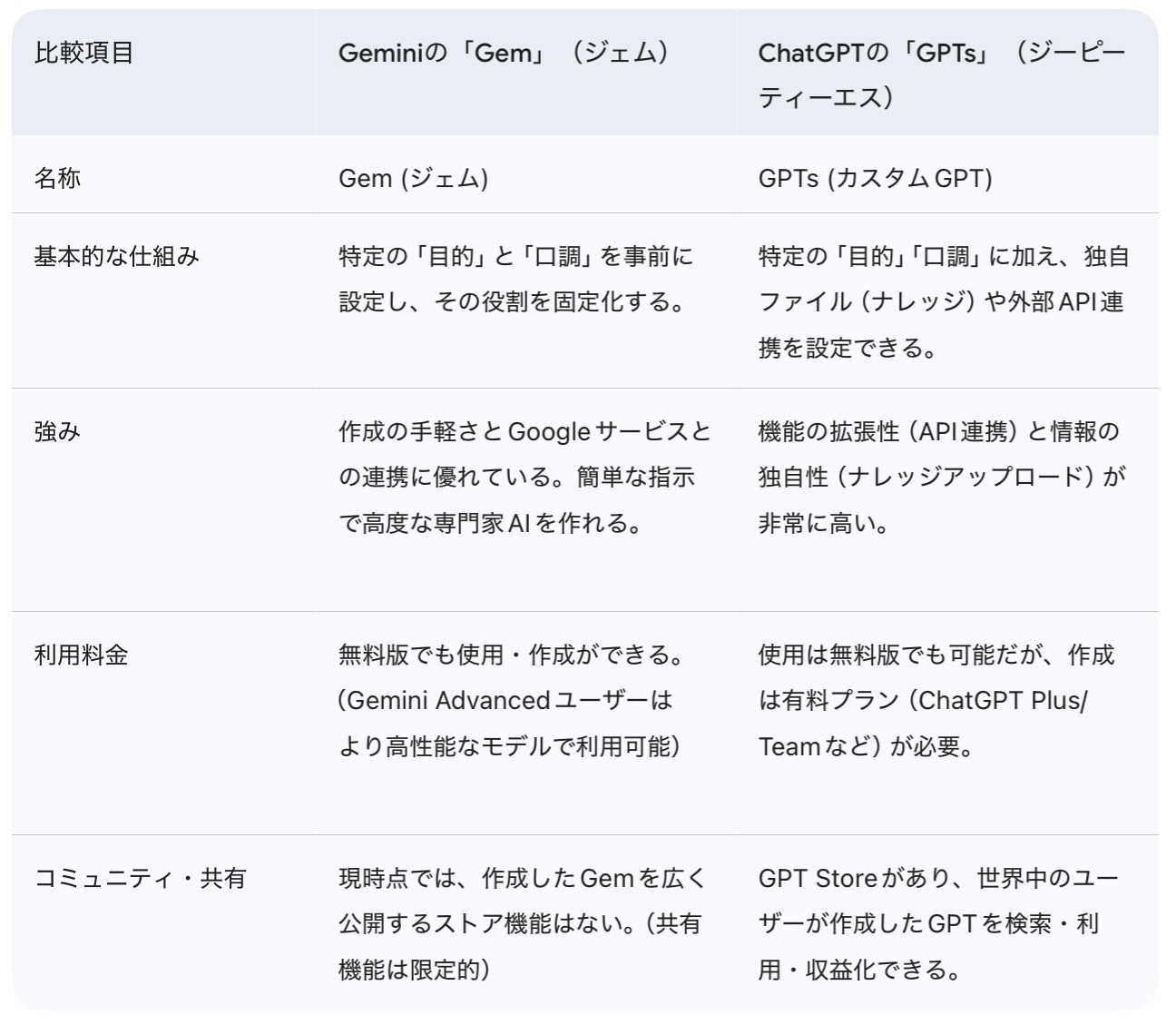 Gemは、GPTsほど複雑な外部連携(API)や独自の知識ファイル(ナレッジ)のアップロードはできませんが、手軽に作れて無料で使えるという点で、非常に強力な機能です。