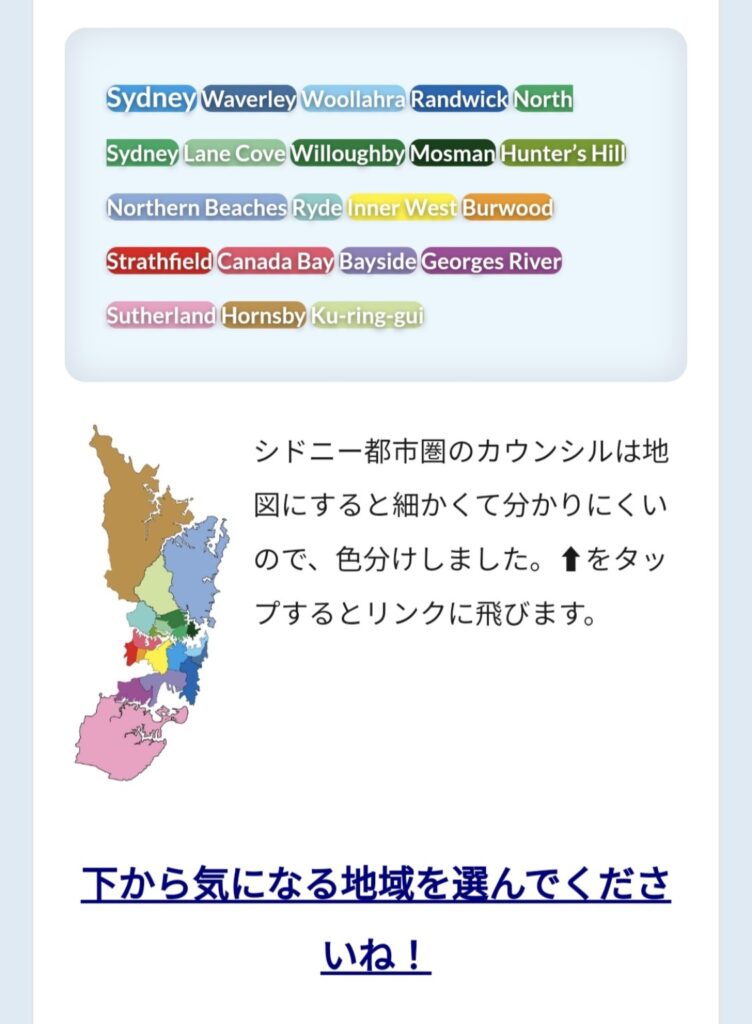 正直に言うと、この地図めっちゃわかりやすいです。サバーブの名前がごちゃごちゃしてて混乱しがちなシドニーを、「はい、色分けしました、押すと飛べます」って見せてくるのは親切設計。読者的には「うわ、ありがてえ!」ってなるやつ。